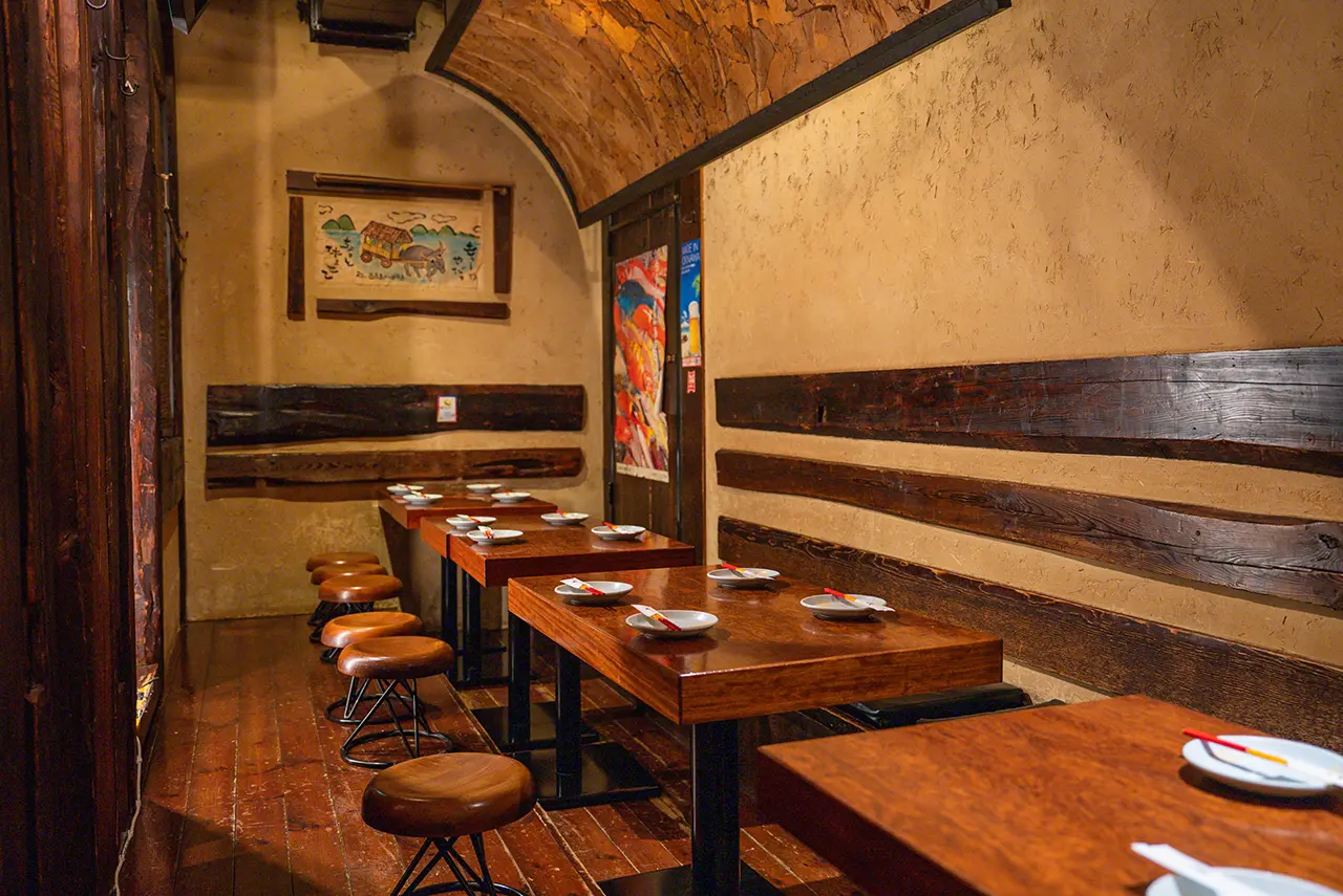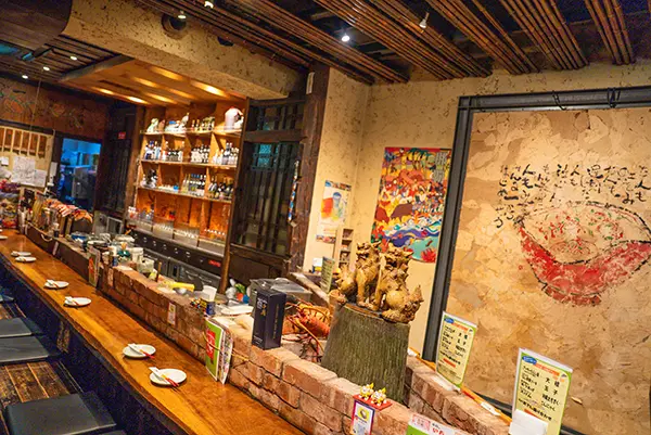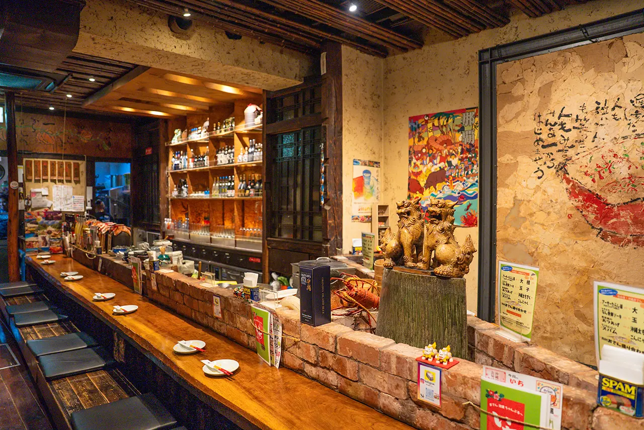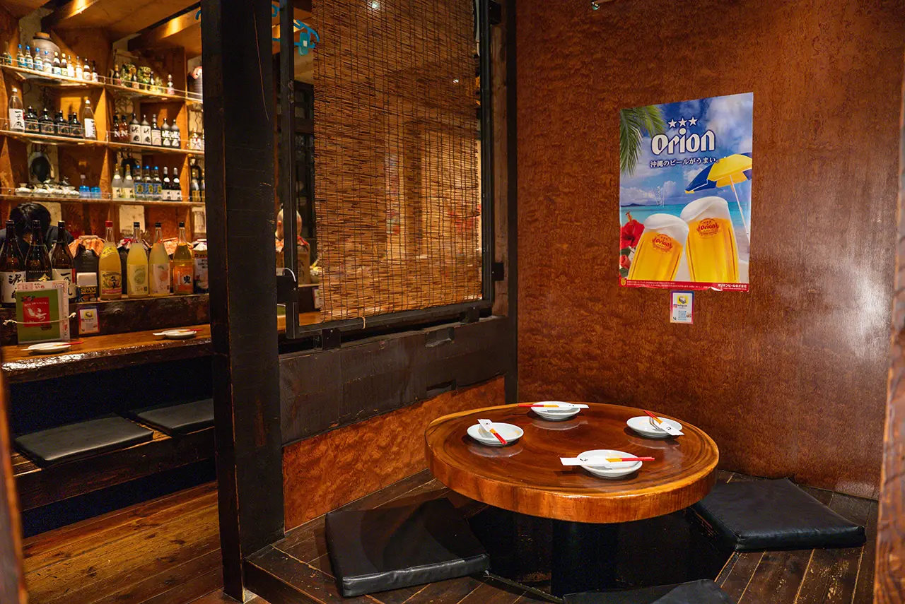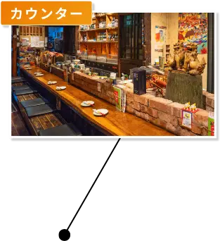 泡盛や焼酎がズラリと並ぶカウンター席でゆったりと沖縄の味をご堪能いただけます。料理人が目の前で仕上げる料理の香りや音を楽しみながら、泡盛片手に至福のひとときを。