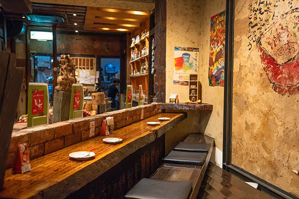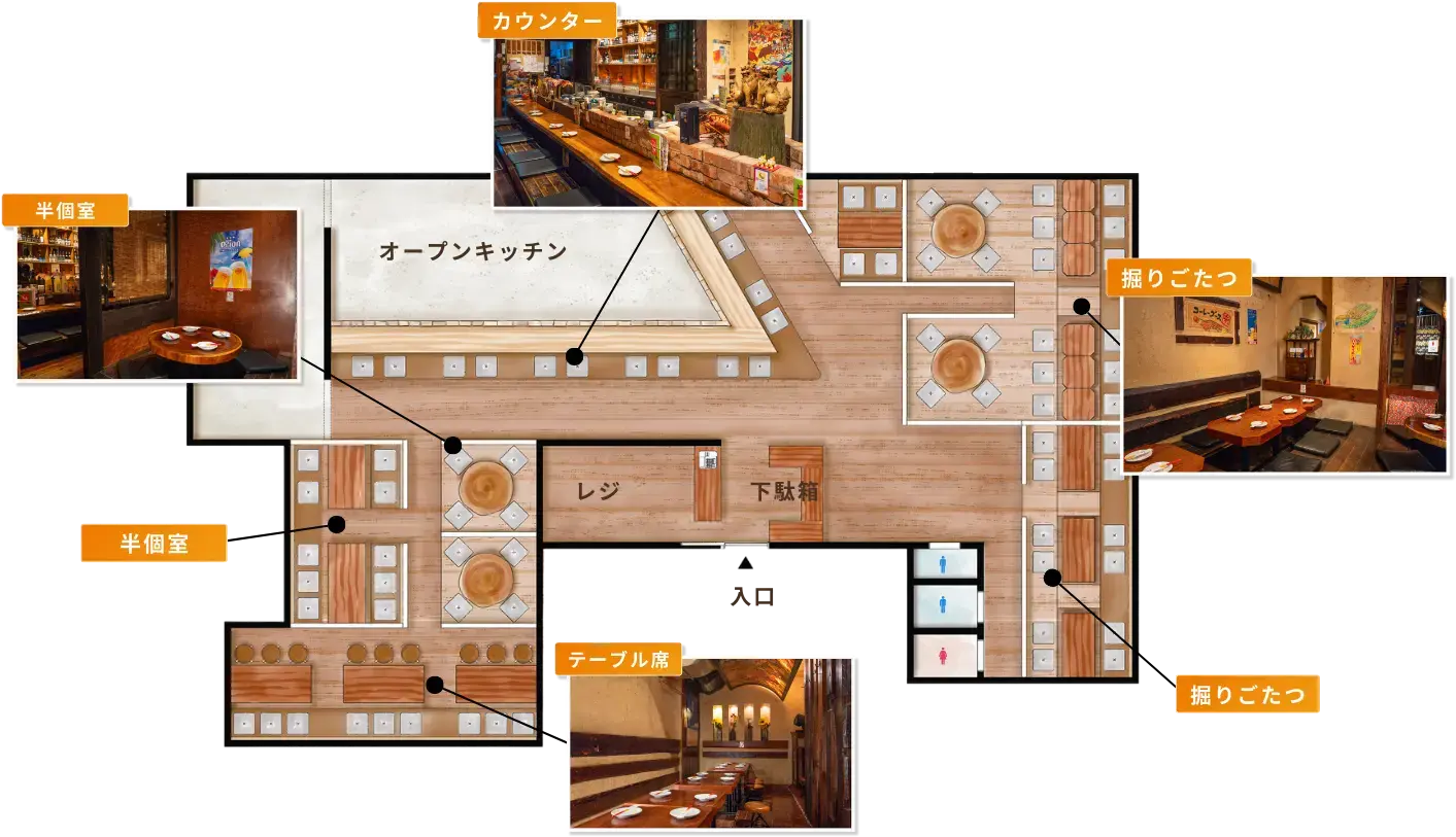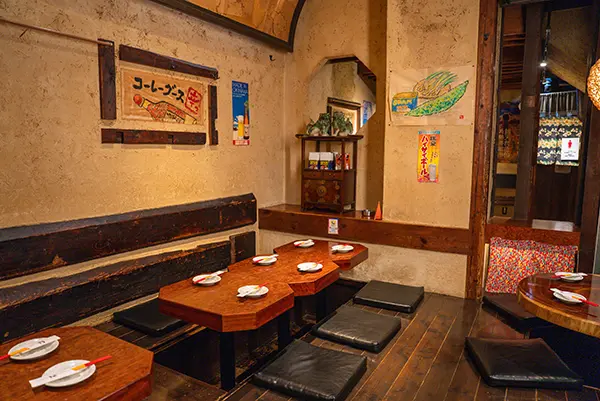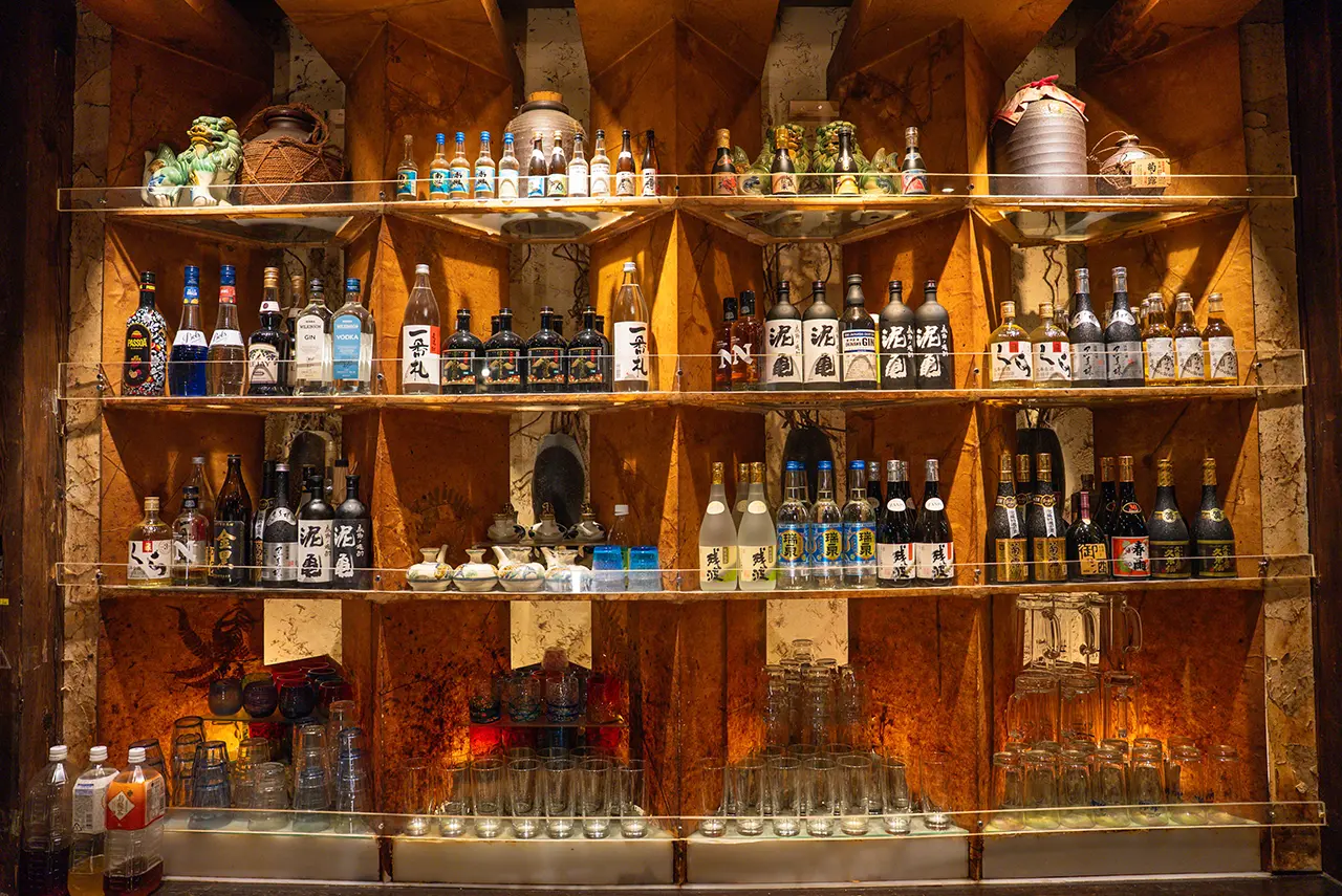 泡盛や焼酎がズラリと並ぶカウンター席でゆったりと沖縄の味をご堪能いただけます。料理人が目の前で仕上げる料理の香りや音を楽しみながら、泡盛片手に至福のひとときを。