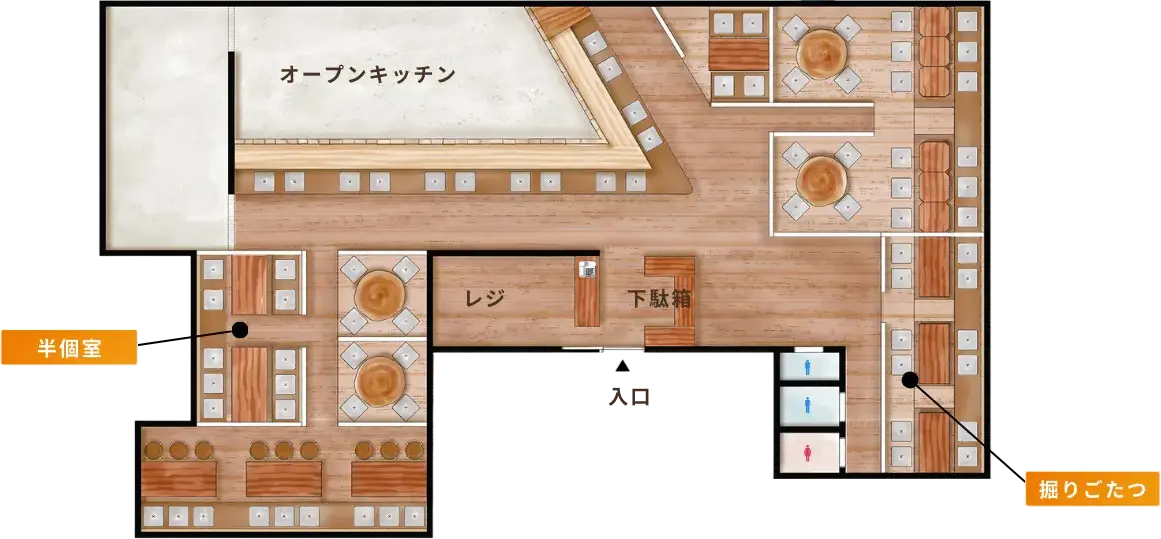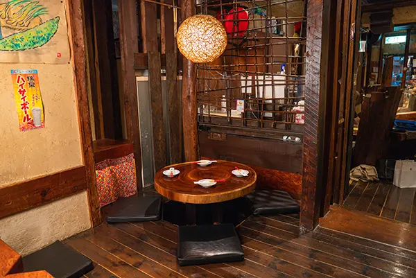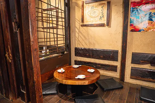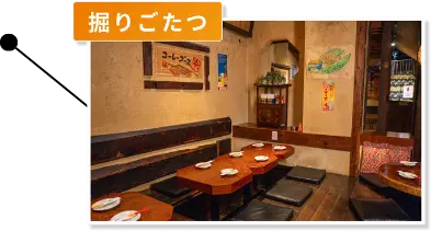 木の温もりを感じながら、足を伸ばしてゆったりとくつろげる掘りごたつ席と切り株のような円卓。温かみを感じる空間で会話が弾むひとときをお過ごしください。